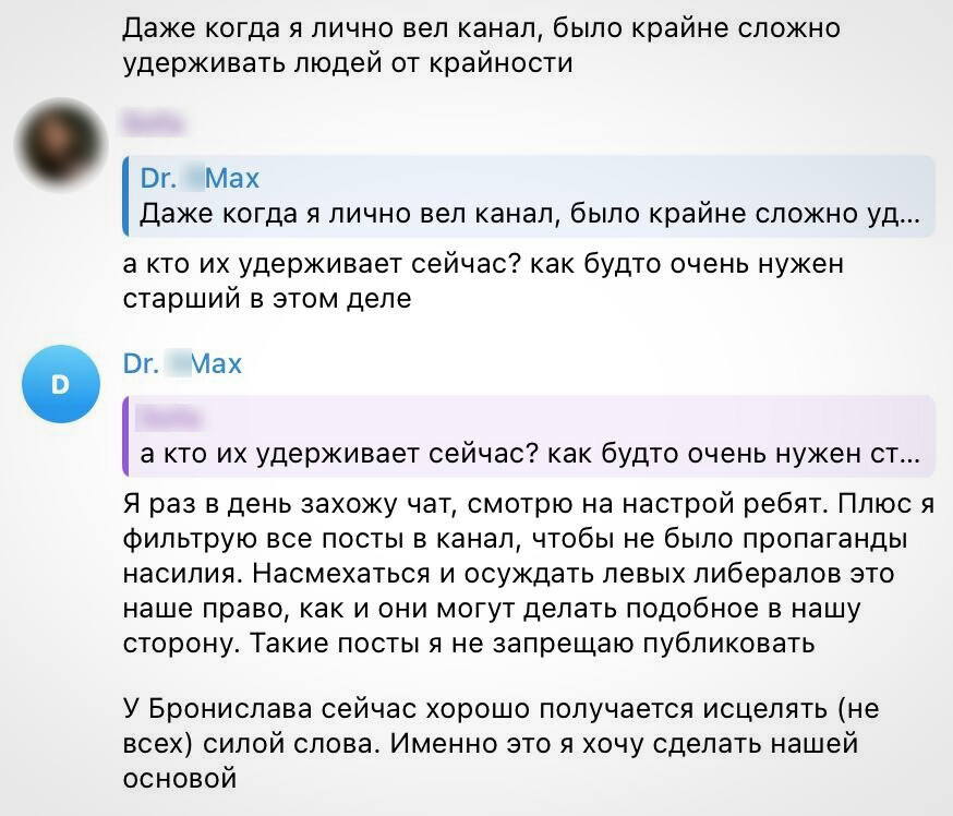 Целитель Первый (Максим С.) при этом настаивает, что его последователи — не «армия головорезов», а «сообщество, которое помогает встать на “правильный путь”». После разговора с «Гласной» он разместил в телеграм-канале поясняющий пост о целях и идеологии «Империи», которую их основатель называет «большой семьей». Несмотря на напоминания лидера движения о том, что его участникам не стоит открыто призывать к убийствам или физическому насилию, подобная риторика в чате не затухает.
